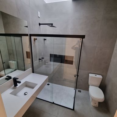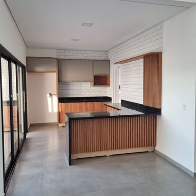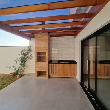 ▪️Área gourmet com armários planejados, churrasqueira e cobertura em pergolado de vidro.