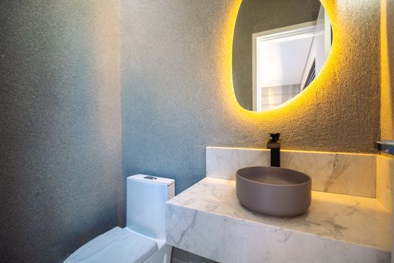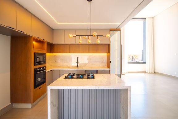 📍Mármore Branco Paraná na cozinha, área gourmet e lavabo