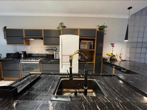cozinha planejada com ilha em pedra via láctea