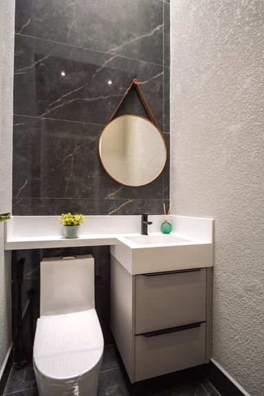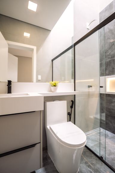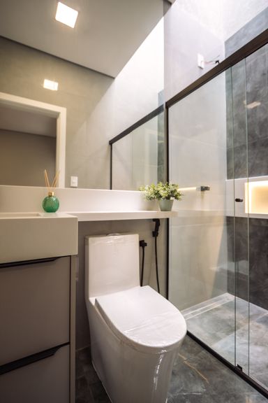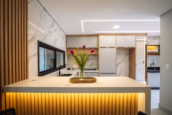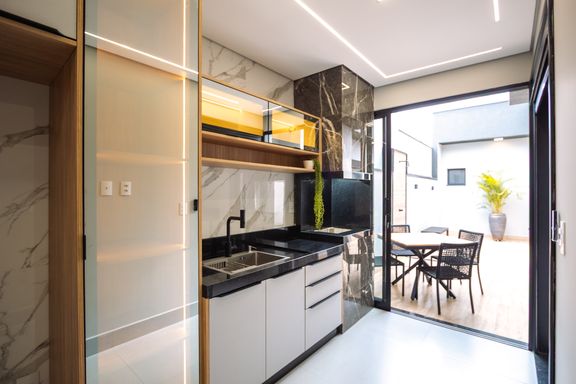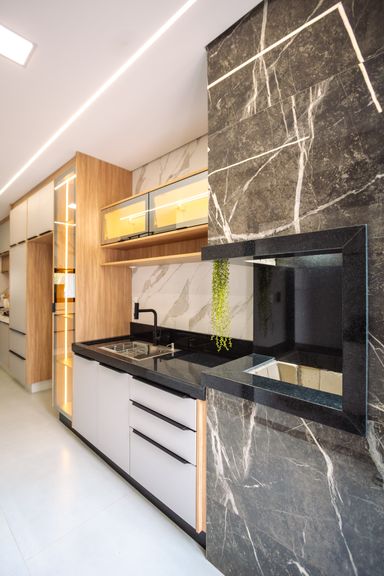 Pia e balcão da cozinha em quartzo branco estellar, banheiros em branco prime, soleiras e pia gourmet em preto São Gabriel.