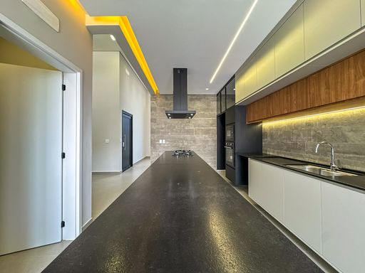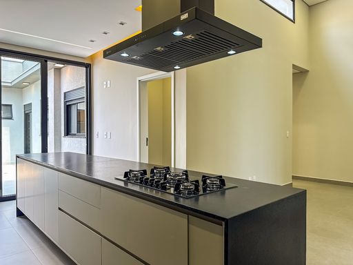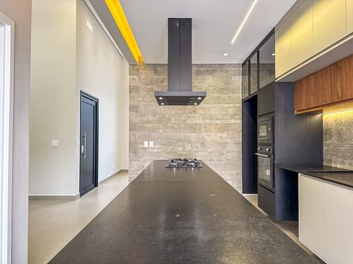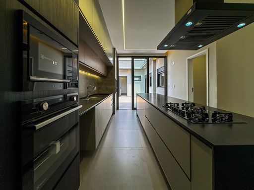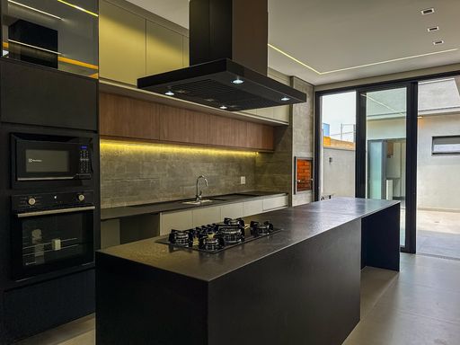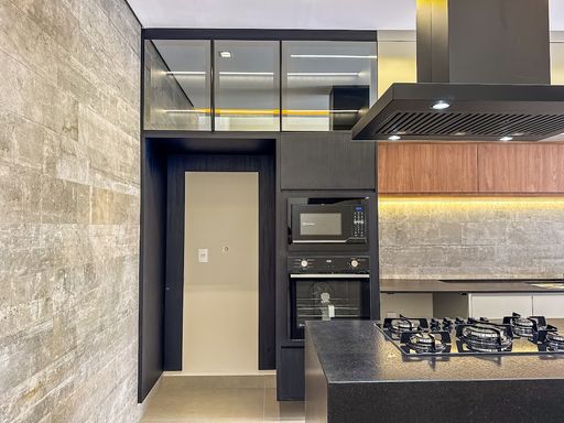 Cozinha equipada com cooktop, forno, microondas, coifa a armários planejados