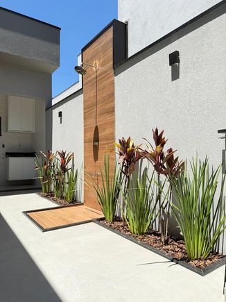 3 suítes, lavabo, cozinha e gourmet integradas, quintal equipado com chuveirão e jardim.