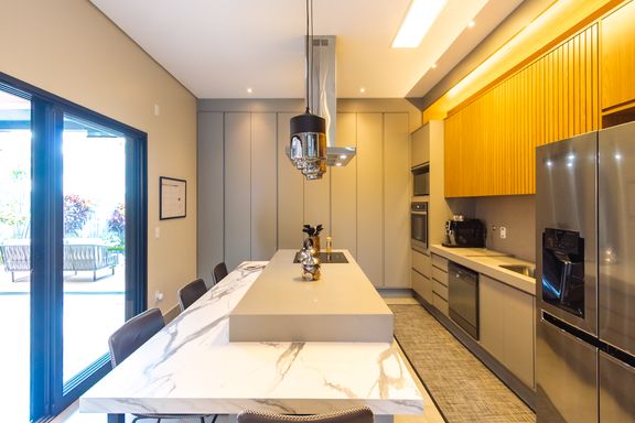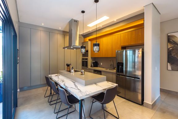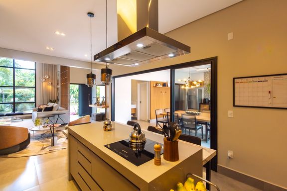 A cozinha é um verdadeiro sonho, com uma ilha equipada com fogão por indução, coifa e forno, tudo para facilitar suas refeições.