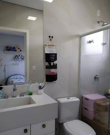 Banheiro com duas cubas esculpidas e armários. Todos os banheiros já com armários, box e espelhos.