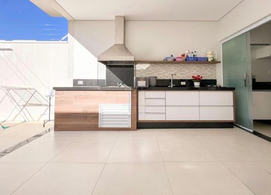 Espaço Gourmet com armários planejados, churrasqueira com coifa em inox com vidros.