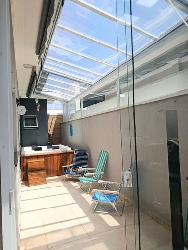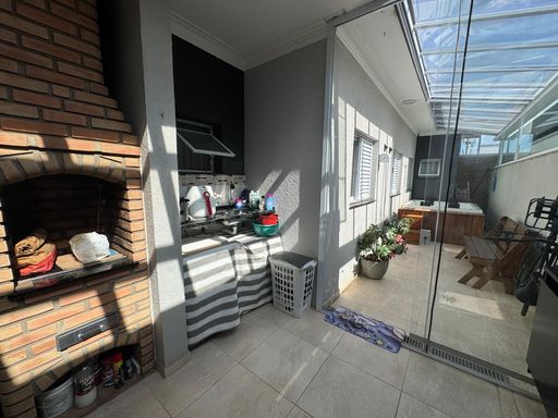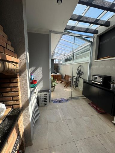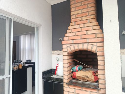 Área Gourmet com churrasqueira, planejados, cobertura e porta de vidro;