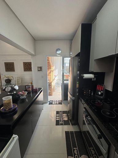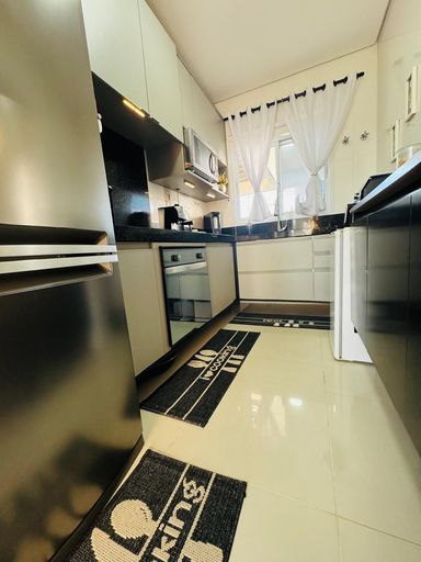 Cozinha americana com armários planejados, cooktop de indução, coifa e forno;